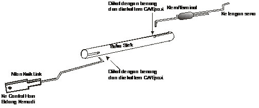 º Gerakan pushrod maju mundur untuk mensimulasikan gerakan servo. Pushrod harus dapat bergerak bebas, jika tidak maka aturlah kawat seperlunya. Rasakan batas depan dan belakang dari lengan servo kemudian dengan pengaturan yakinkan bahwa hubungan lengan servo ke throttle adalah dalam range pergerakan lengan throttle.