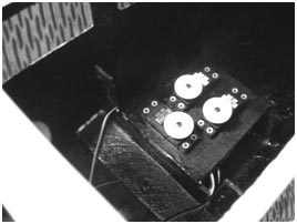 º Tempatkan dudukan tripleks di bawah ujung depan servo tray sehingga berada 3 cm di atas lantai badan pesawat. Dudukan ini cukup panjang sehingga akan masuk kedalam badan. Amplaslah satu sisi sampai dudukannya tepat. Rekatkan dudukan servo ini ke semua sisi.