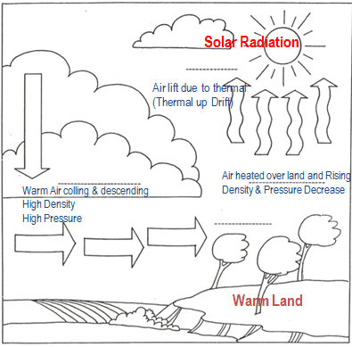In a place (usually a land) if received high solar radiation, it will have an impact in air temperature. The air over this land will have air temperature increased. As the temperature increased, the air pressure will decreased. The air will be pushed upward. This phenomena is called Thermal Up Drift.