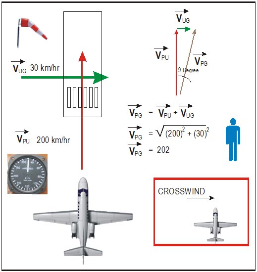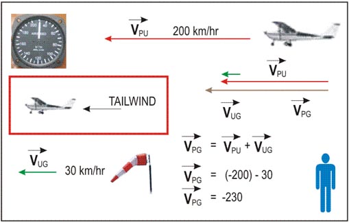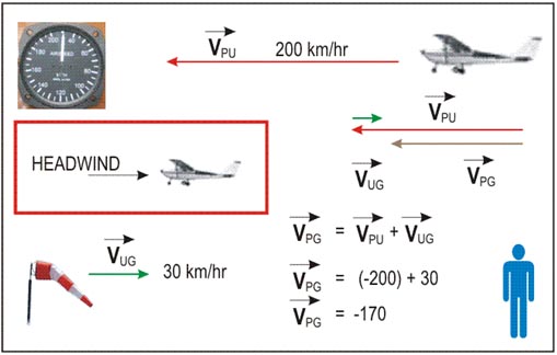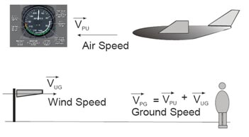 This relative movements phenomena is happened also in the aircraft fly in the air. Pilot will have measurement of the air speed VPU, i.e. the speed or the aircraft moving relative to the air surroundings. If the air is moving VUG relatively to the ground. Hence a people on the ground see the aircraft speed as the following