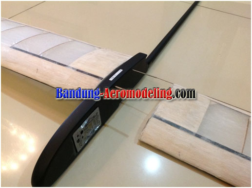Pasangkan sayap pada badan dengan bantuan wing joiner baja 4 mm dan 2 mm yang tersedia. Usahakan agar pemasangan sambungan sayap ini cukup kuat, pas dan tidak goyang. Pergunakan selotape bila perlu untuk mengunci posisi sayap kiri dan kanan agar tidak mudah lepas.