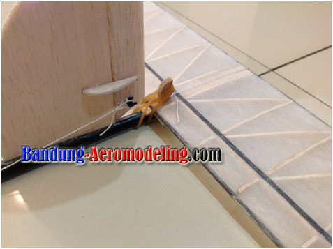 Gerakan rudder kita batasi yaitu 00 ke kiri dan 30 ke kanan dengan memberikan pembatas dari kayu balsa yang kita rekatkan dengan lem cyanoacrylate (CA).