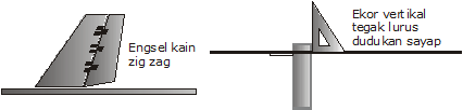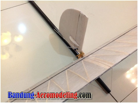 Ekor vertikal yang terdiri dari fin dan rudder terbuat dari balsa 3 mm, keduanya kita hubungkan dengan engsel kain yang dilemkan secara zig-zag. Ekor ini selanjutnya kita tanam pada badan di bagian belakang dengan posisi yang tepat tegak lurus terhadap dudukan sayap dan lurus kebelakang jika kita lihat dari hidung pesawat.