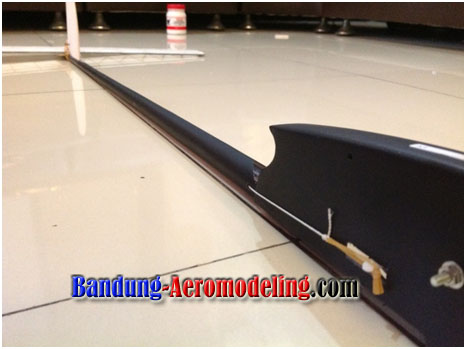 Badan bagian depan yang terbuat dari fiberglass kita rekatkan ke tail boom yang merupakan bahan komposit fiberglass carbon fiber. Pergunakan lem Epoxy untuk penyambungan ini dan pastikan bahwa permukaan yang akan dilem tidak tertutup cat atau pelapis. Oleh karenanya sebaiknya kedua sisi permukaan yang akan direkatkan diampelas dahulu dengan ampelas kasar no.120 dengan panjang bidang perekatan sekitar 5 cm.