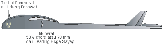 Masukan pemberat dari timbal atau timah hitam pada hidung pesawat model di tempat yang telah disediakan. Stabilo kita ikatkan pada badan bagian belakang dengan karet gelang dan model kita kita pegang pada titik beratnya sekitar 6.5 – 7.5 cm dari Leading Edge Sayap. Timbal kita tambahkan di hidung model hingga pesawat dirasakan tidak berat ke belakang dari titik berat yang ditentukan.