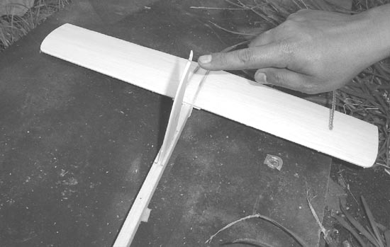 Ditempat nantinya sayap diletakkan kita tempelkan dudukan sayap atau wing mount dari balsa/tripleks 3 mm. Sedikit dibawahnya kita lubangi dengan bor 3 mm dan kita pasangkan dowel bambu 3 mm untuk pegangan sayap dengan karet gelang.