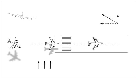 With a slight residual bank angle, a touchdown is typically accomplished with the upwind main wheels touching down just before the downwind wheels. Excessive control must be avoided because over-banking could cause the engine nacelle or outboard wing flap to contact the runway/ground.