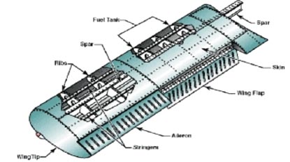 Struktur yang paling penting dalam struktur sayap khususnya dengan jenis yang konvensional yang kita bahas kali ini adalah spar atau tulang utama. Spar ini dipasang dalam arah memanjang kearah bentang sayap dari pangkal kearah tepi. Tujuannya spar ini akan menahan pembebanan yang terbesar yang berupa moment lentur yang tadi sempat saya jelaskan. Pada bagian depan dan bagian belakang spar kita akan menjumpai komponen yang kita sebut sebagai web. Web ini pada umumnya dipasang vertikal yang menghubungkan spar bawah dengan spar bagian atas. Tugas dari web diantaranya adalah untuk menjaga agar spar tidak terdefleksi berlebihan atau melengkung.
