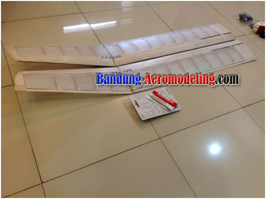 Pasangkan sayap pada badan dengan bantuan wing joiner baja 4 mm dan 2 mm yang tersedia. Usahakan agar pemasangan sambungan sayap ini cukup kuat, pas dan tidak goyang. Pergunakan selotape bila perlu untuk mengunci posisi sayap kiri dan kanan agar tidak mudah lepas.