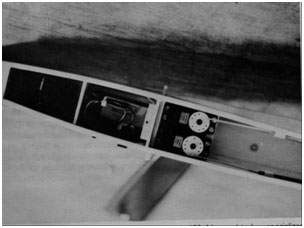 • Tempatkan pushrod di tempat sesuai seperti pada gambar disamping ini, buatlah bengkokan sebanyak yang diperlukan. Dengan bekerja dari kabin, masukan pushrod untuk rudder melalui badan bagian belakang dan keluar di lubang ini. Satu benang untuk menuntun keluarnya kawat ke lubang keluaran.